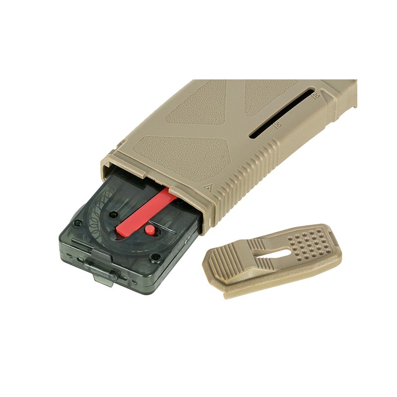 Arcturus nos trae este cargador de media capacidad 130 rondas. Un botón cambia fácilmente de capacidad media a capacidad real del cargador. Carcasa del cargador de una sola pieza que proporciona mayor durabilidad. Fabricado en polímero reforzado con fibra. Aplicado con material de alta resistencia proporcionando textura externa de alta calidad. El diseño especial del seguidor garantiza que no quede ninguna bola después del disparo final. Compatible con la mayoría de AEG del mercado, incluidos Arcturus, Ares, Cyma, APS, GG, EL, Arcturus, etc.