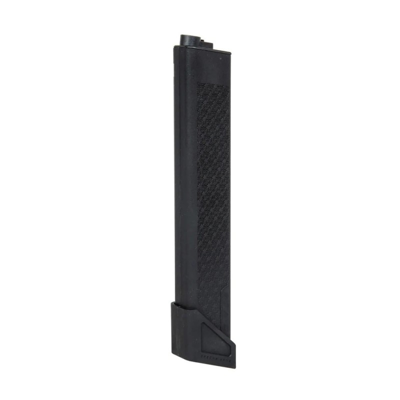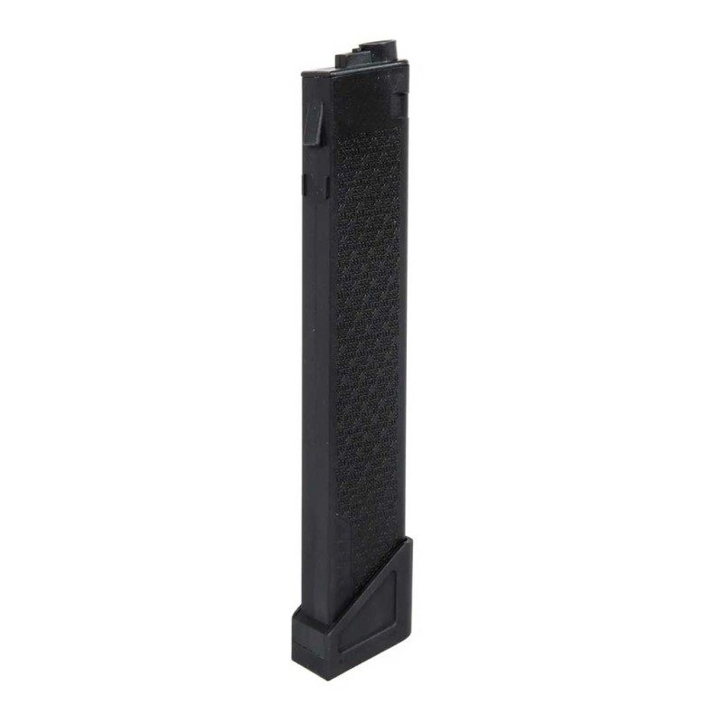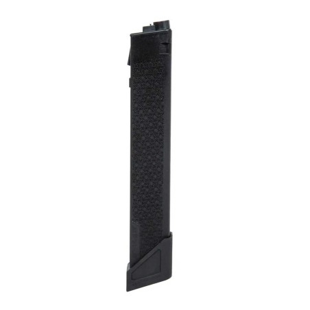Dimensiones (medidas): No se especifican dimensiones exactas en las fichas comerciales consultadas. (Se trata de un cargador tipo SMG/9 mm con perfil delgado; si necesitas medidas exactas (alto/ancho/profundidad) puedo intentar obtenerlas de la marca o medir una unidad física si las facilitas).