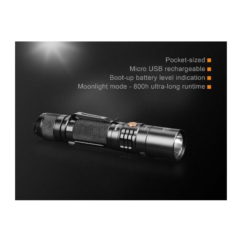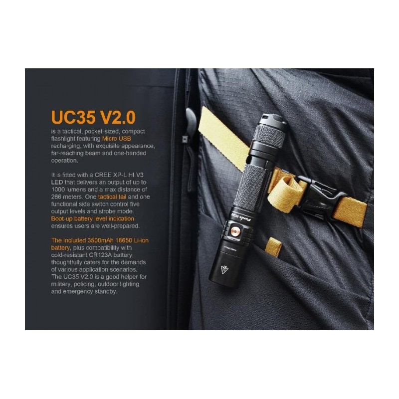 La UC35 V2.0 es una linterna táctica, de bolsillo, compacta, con recarga Micro USB, con una apariencia exquisita, un haz de luz de gran alcance y una operativa con una sola mano.