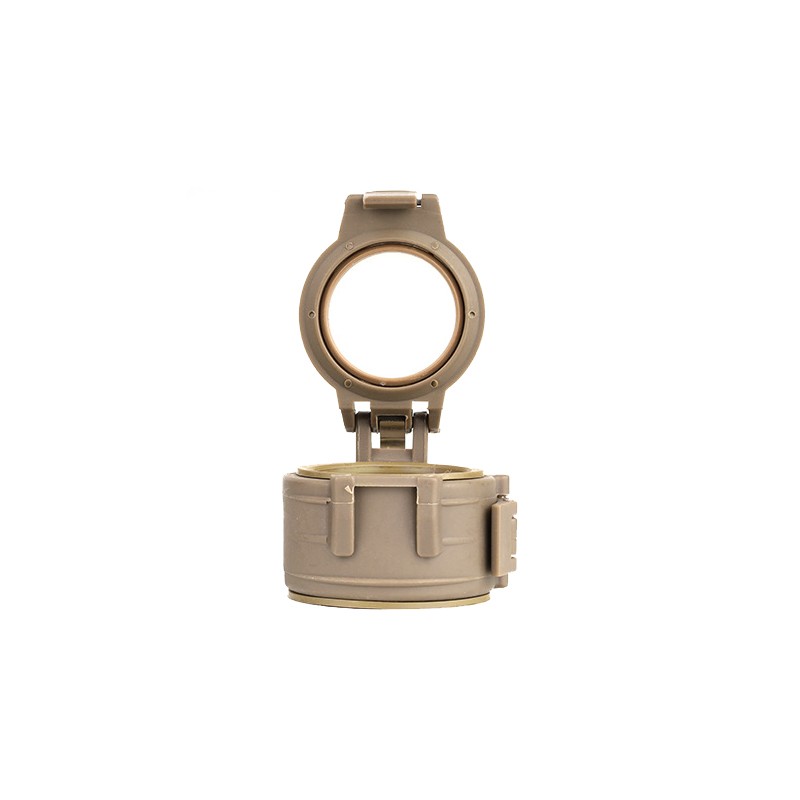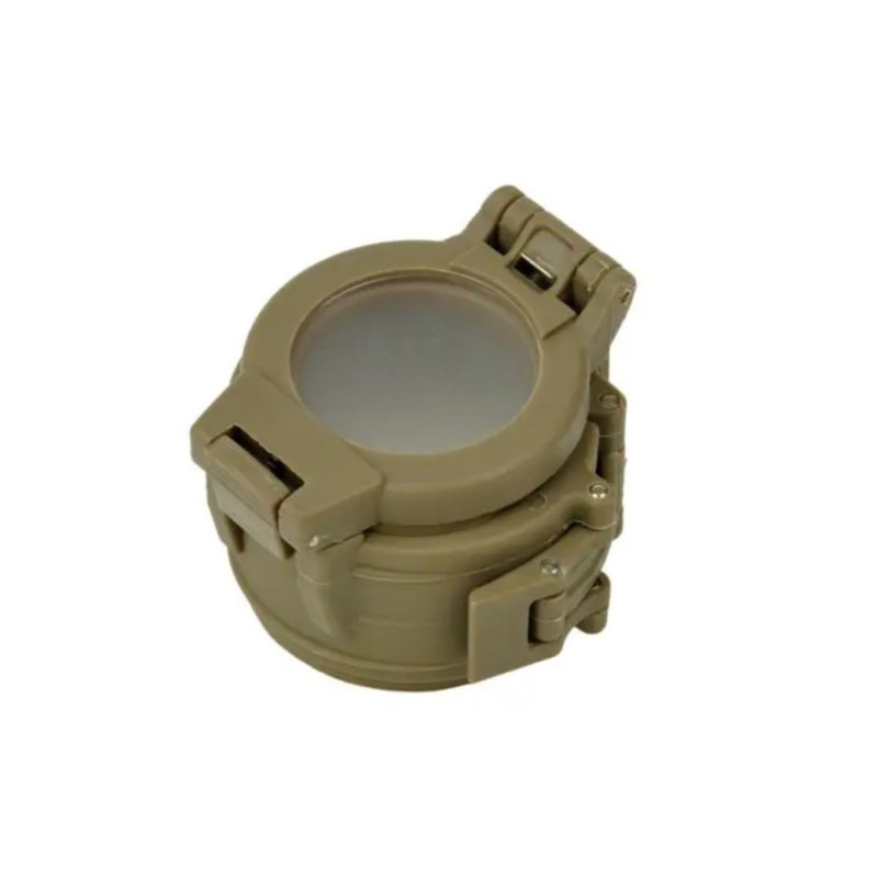 Difusor para linterna tipo M971. Cuando la luz incide en la plata translucida del difusor la luz se dispersa formando un halo de ambiente que está menos focalizada que la luz emitida por la linterna sin este acople, pensado para usarse como luz de ambiente en entornos cerrados y de forma momentánea (tiendas de campaña, vivac, habitaciones, etc). El diámetro interno es de 65mm aprox, por lo cual solo sirve para la M971 de cabeza grande.