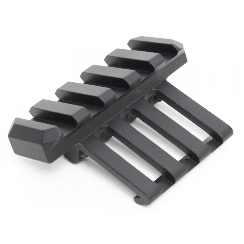 Montura lateral para rail Picatinny que permite el acople de accesorios en un ángulo de 45º dejando despejada la parte superior del RIS y aprovechando un ángulo diferente para miras de punto rojo, pudiendo llevar la mira de aumentos en el rail principal y usar el punto con tan sólo un giro de réplica.