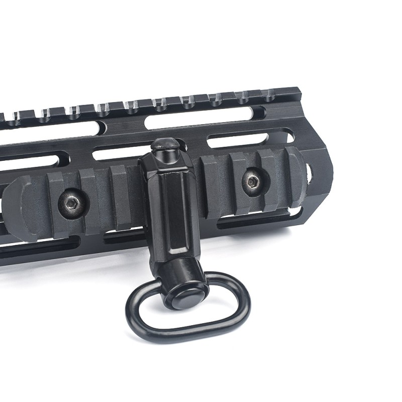 Montura metálica para rail Picatinny, con anilla QD para poder enganchar una correa porta fusil que puede ser desenganchada en cuestión de segundos gracias a su botón central que suelta la anilla giratoria. El material metálico le da una gran tenacidad y robustez al conjunto lo cual permite llevar nuestra réplica de Airsoft de forma segura y cómoda.