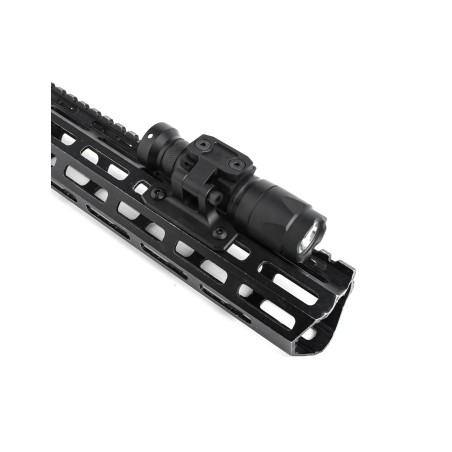 Se trata de una montura ligera y resistente diseñada para instalar linternas tácticas tipo Scout como las Surefire M300 y M600 en sistemas de rieles KeyMod y M-LOK. Esta pieza permite fijar la linterna en posición descentrada o elevada respecto a la línea superior del guardamanos, liberando espacio sobre el riel para otros accesorios y mejorando la ergonomía en configuraciones tácticas o de airsoft.