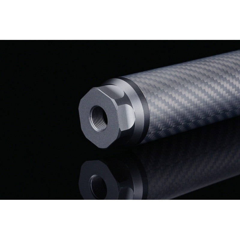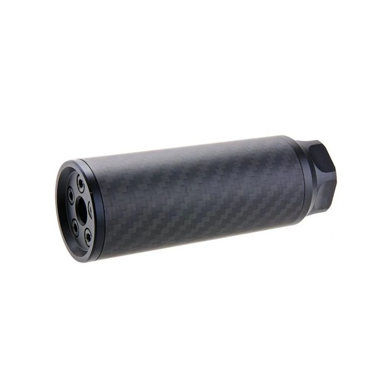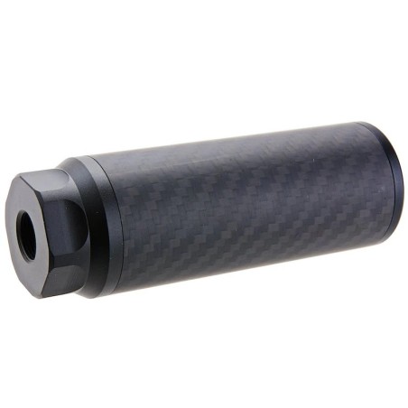 Añade un toque de élite táctica a tu réplica con este silenciador “dummy” de carbono de 115 mm. Su diseño compacto no solo realza la estética sobria y profesional, sino que también mantiene la línea del cañón limpia y estilizada, sin sobresalir demasiado. Fabricado con materiales ligeros y robustos, combina cuerpo de fibra de carbono con elementos mecanizados en aluminio CNC, resultando en un accesorio elegante pero funcional para montajes exigentes.
