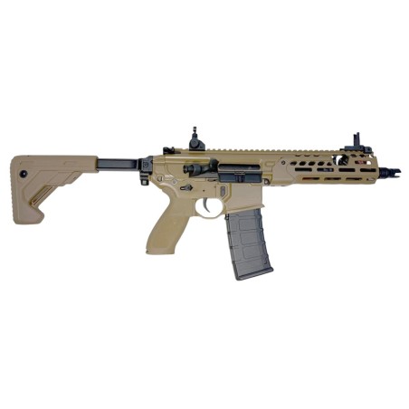 Fusil eléctrico de airsoft (AEG) inspirado en la plataforma MCX SPEAR-LT, fabricado por E&C en acabado FDE (Flat Dark Earth). Está diseñado para ofrecer modularidad táctica, construcción robusta y electrónica avanzada (gatillo ETU) que mejora la respuesta de disparo y permite modos de fuego programables, ideal tanto para juegos CQB como al aire libre.