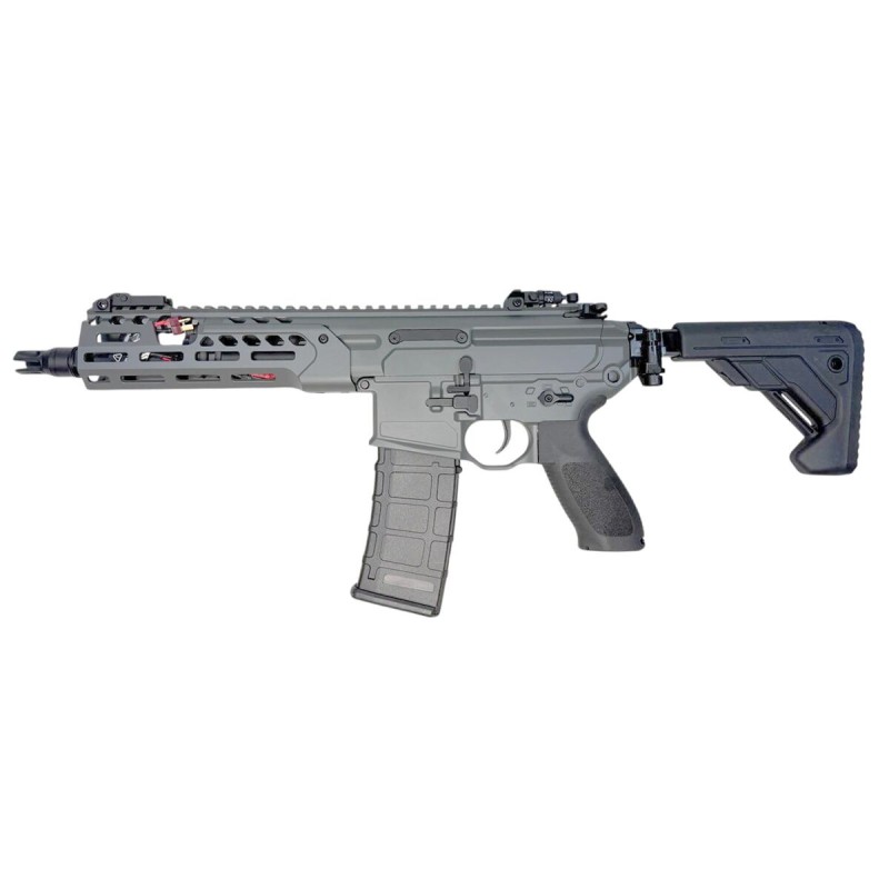 Fusil eléctrico de airsoft (AEG) inspirado en la plataforma MCX SPEAR-LT, fabricado por E&C en acabado FDE (Flat Dark Earth). Está diseñado para ofrecer modularidad táctica, construcción robusta y electrónica avanzada (gatillo ETU) que mejora la respuesta de disparo y permite modos de fuego programables, ideal tanto para juegos CQB como al aire libre.