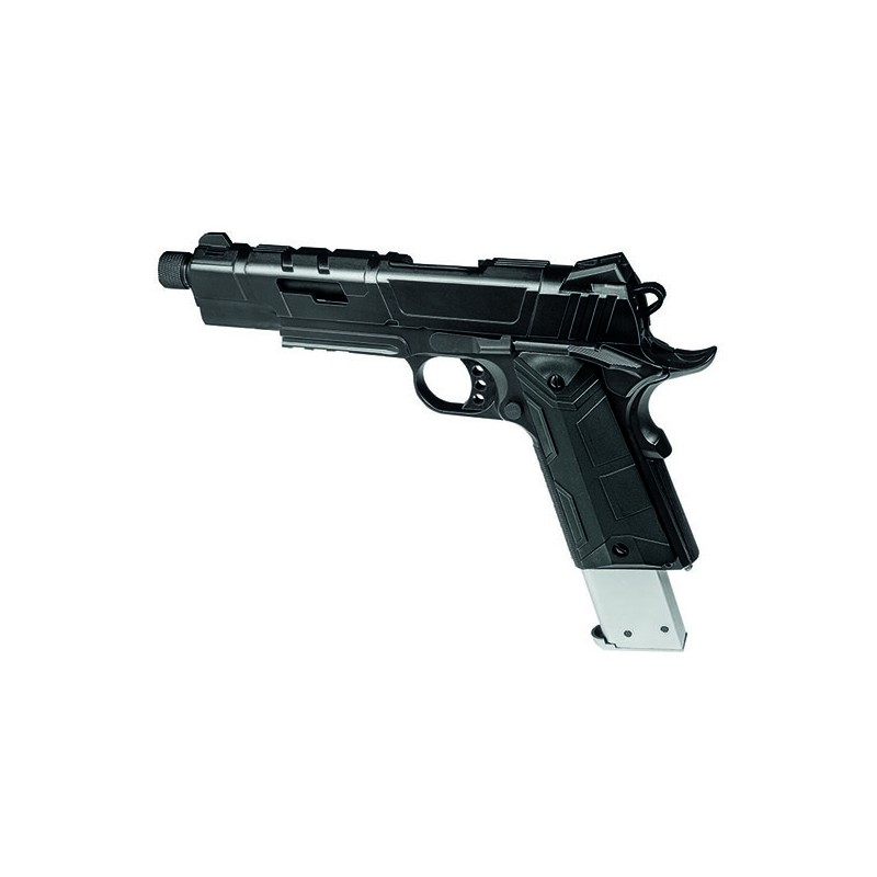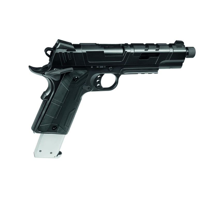 Presentamos esta 1911 custom de la mano del fabricante de armas Amadeo Rossi, de estética agresiva e increíble, esta pistola de diseño geométrico cuenta con un armazón aligerado en múltiples puntos, cañón roscado para la instalación de supresores/trazadores, cachas poligonales en acabado antideslizante y cargador extendido de 35 bbs que no dejará indiferente a nadie, sin duda una pistola digna de un soldado moderno.