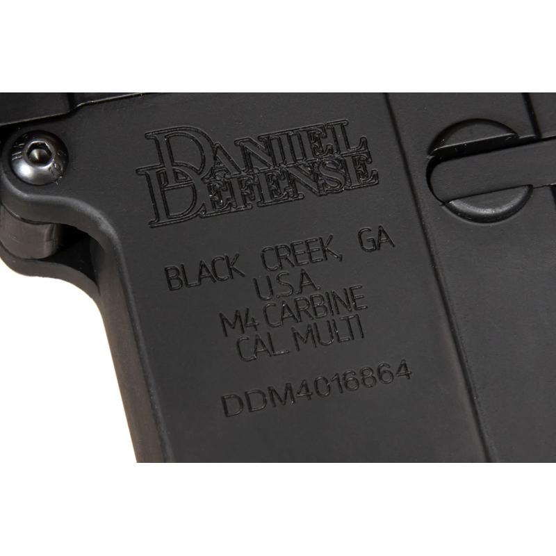 Cada parte de la réplica se ha fabricado y ajustado con atención al detalle, además, se ha utilizado un recubrimiento nano para terminar el cañón para evitar arañazos. El cañón presenta marcas Daniel Defense® grabadas en profundidad, así como un número de serie individual confirmado por un holograma adicional. Un detalle digno de mención es el ojal de doble cara para montar la correa táctica.