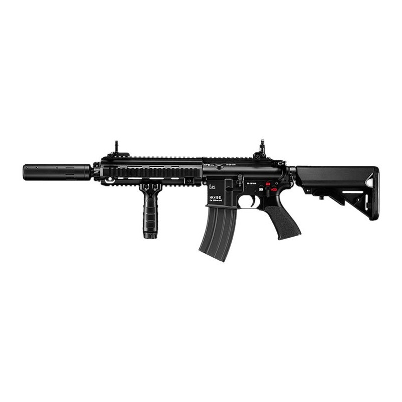 Incluye culata tipo Crane que eleva la comodidad a la hora de encararla, pistolete tipo M4 más fino para un agarre más cómodo, grip vertical largo para mejorar su manejo y el supresor que por excelencia se usa con este modelo de 416.
