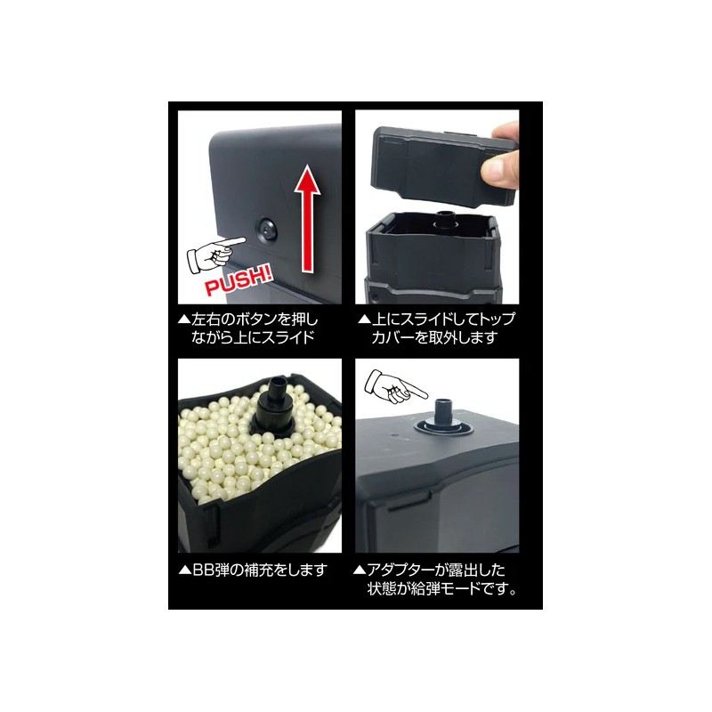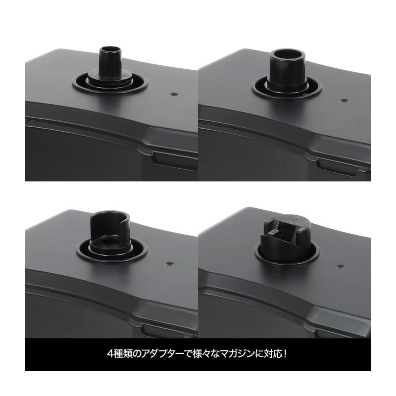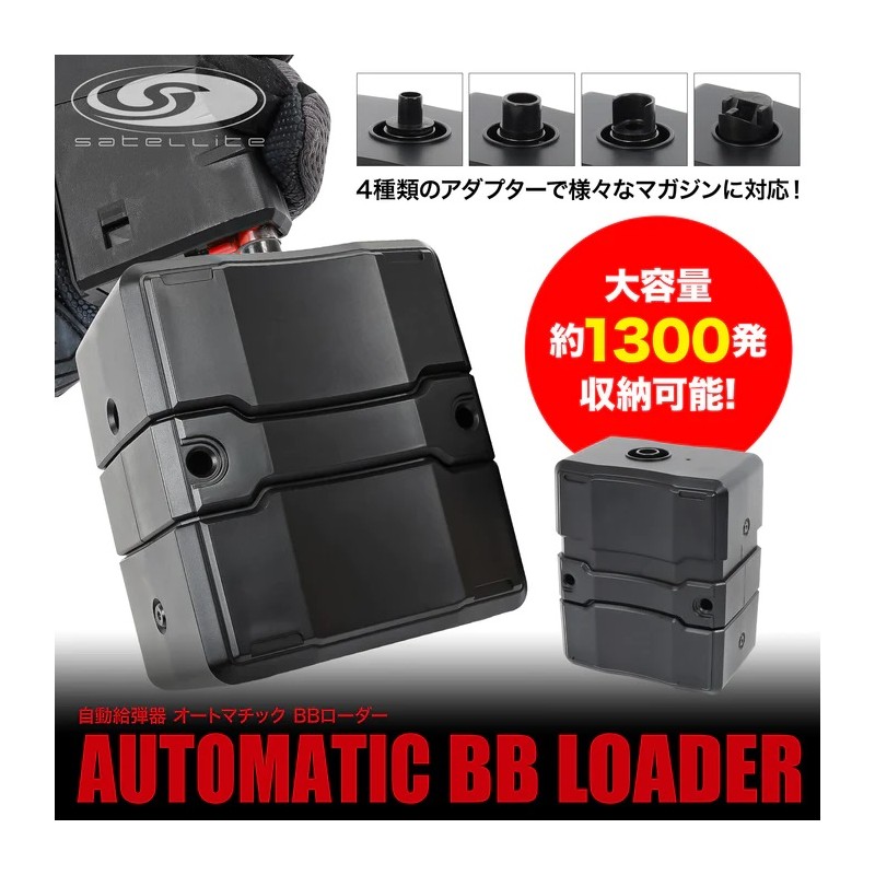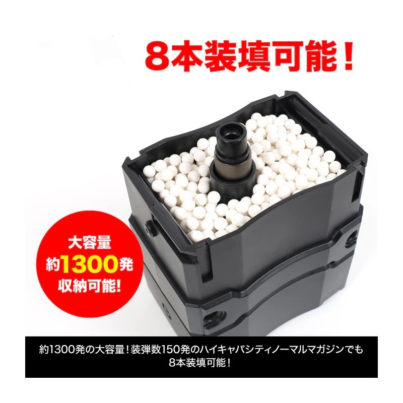 Gran capacidad de aproximadamente 1300bbs y equipado con un modo de seguridad que evita fallos de funcionamiento y daños en el adaptador y en el cargador, además es compatible con varios cargadores con 4 tipos de adaptadores! por lo que se puede utilizar con la mayoría de cargadores normales (cargadores AEG con muelle interno).