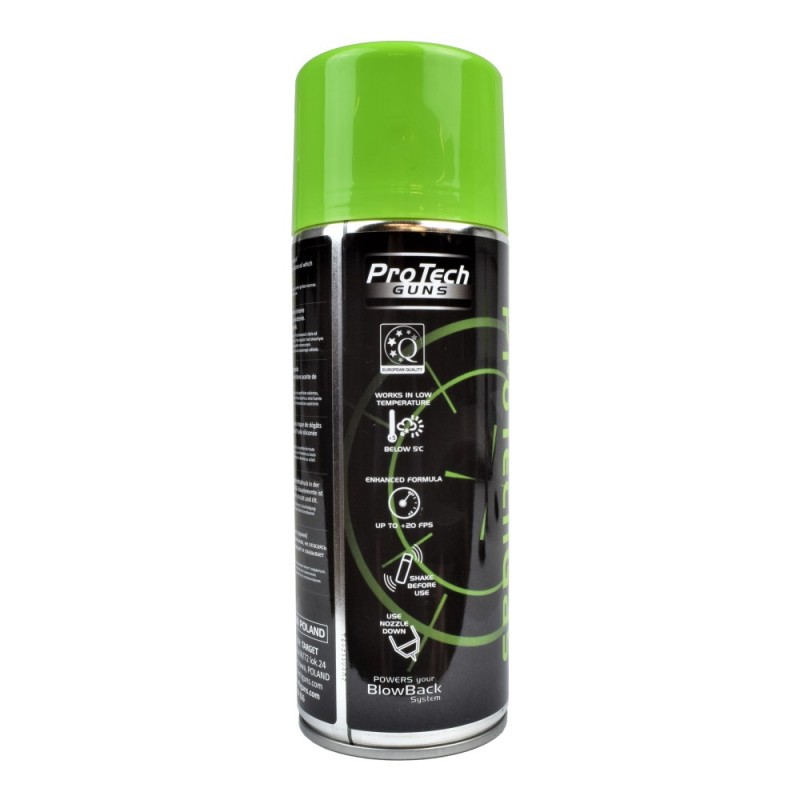 Gas verde Protech, fabricado con una mezcla de gases de altos estándares de calidad está indicado para todo tipo de réplicas sin miedo a que se produzcan roturas. Su fórmula específica lo hacen propio para su uso en temperaturas bajas de hasta 5ºC, pudiendo aumentar la potencia de tu réplica hasta 20FPS.