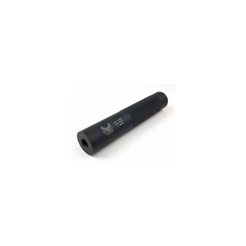 Non-functional reproduction of silencer with AIR FORCE marking made of black painted aluminum.