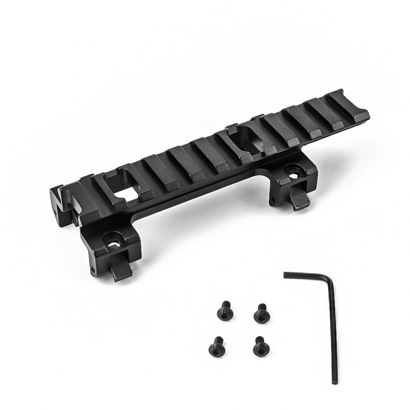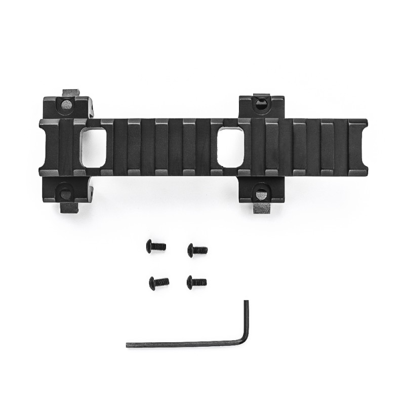Riel Picatinny para el subfusil MP5. Puede ser acoplado en la parte superior de la réplica en las muescas destinadas para ello y permite acoplar de esta manera accesorios con sistema Picatinny como miras, lásers y todo tipo de accesorios que necesitemos durante la partida.
