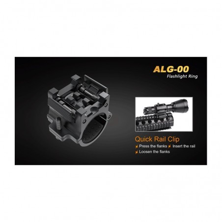 Quick rail clip Adjustable diameter design to fit multiple flashlights Adjustable from 22.5-26mm Precision machined aluminum with matte black anodized finish Non-slip rubber cushion Non-slip rubber cushion Size your mount: