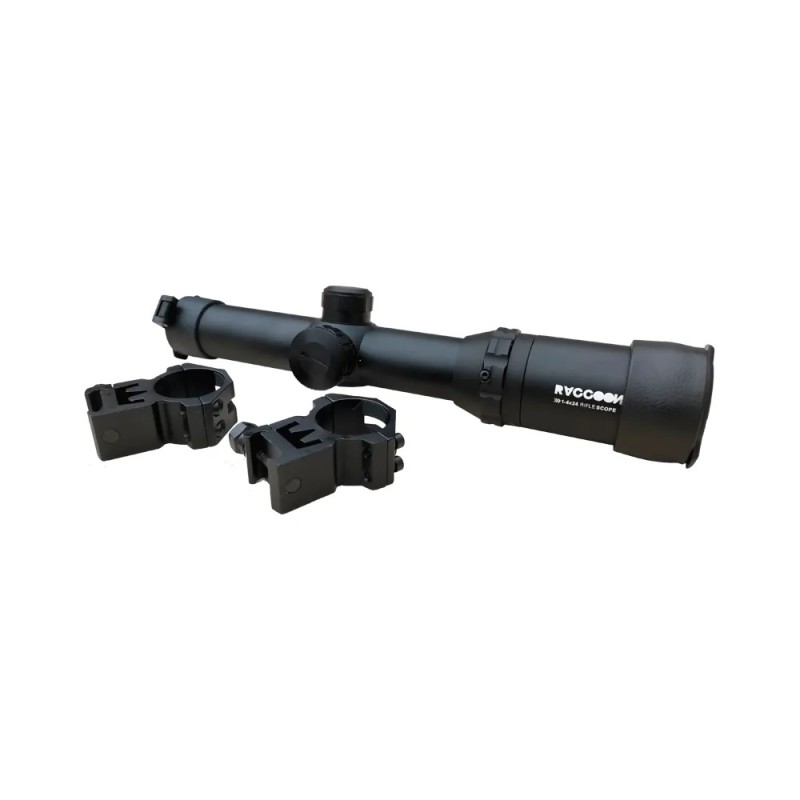 Includes: Dust cover with yellow fog lens, mounting rings, battery, scope.