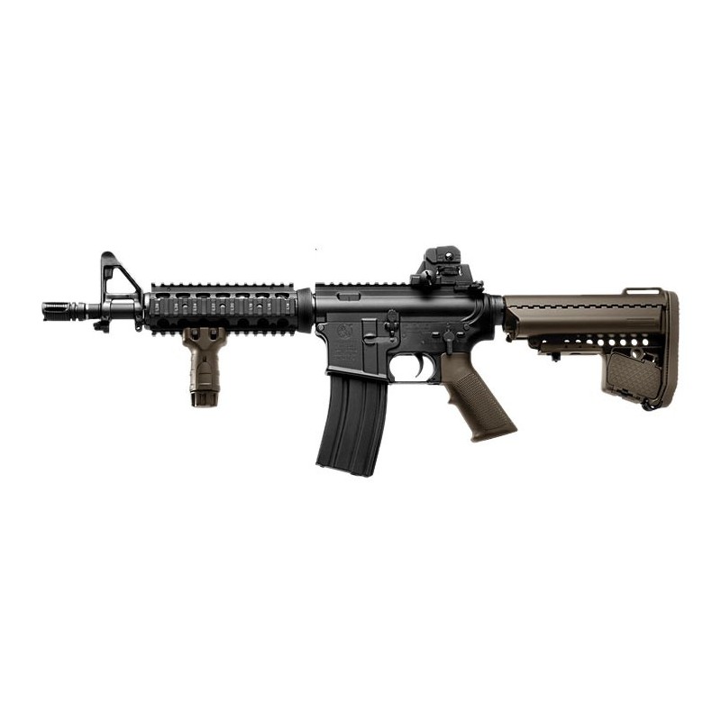 El fusil de asalto CQB-R Recoil de Tokyo Marui es el modelo corto del M4 SOPMOD una carabina usada por las fuerzas Especiales como los SEALS, incorpora retroceso (recoil), blowback y dispone de sistema de parada automática cuando detecta que se queda sin munición para un mayor realismo.