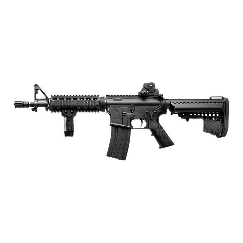 El fusil de asalto CQB-R Recoil de Tokyo Marui es el modelo corto del M4 SOPMOD una carabina usada por las fuerzas Especiales como los SEALS, incorpora retroceso (recoil), blowback y dispone de sistema de parada automática cuando detecta que se queda sin munición para un mayor realismo.