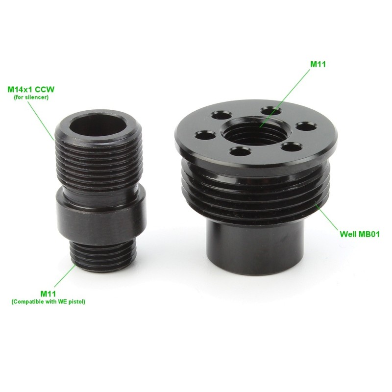 Juego de adaptadores para silenciadores para rifles y pistolas de airsoft. El paquete incluye una elegante tapa de extremo del cañón del rifle Well MB01 y un adaptador de acero para el silenciador de la pistola WE.  La tapa del cañón se puede utilizar en el rifle de francotirador por separado, o utilizar el adaptador para atornillar el silenciador.  Este adaptador de acero también se puede utilizar para instalar el silenciador en una pistola de gas WE. La rosca más pequeña es M11 derecha y la más grande es la clásica M14x1 izquierda.