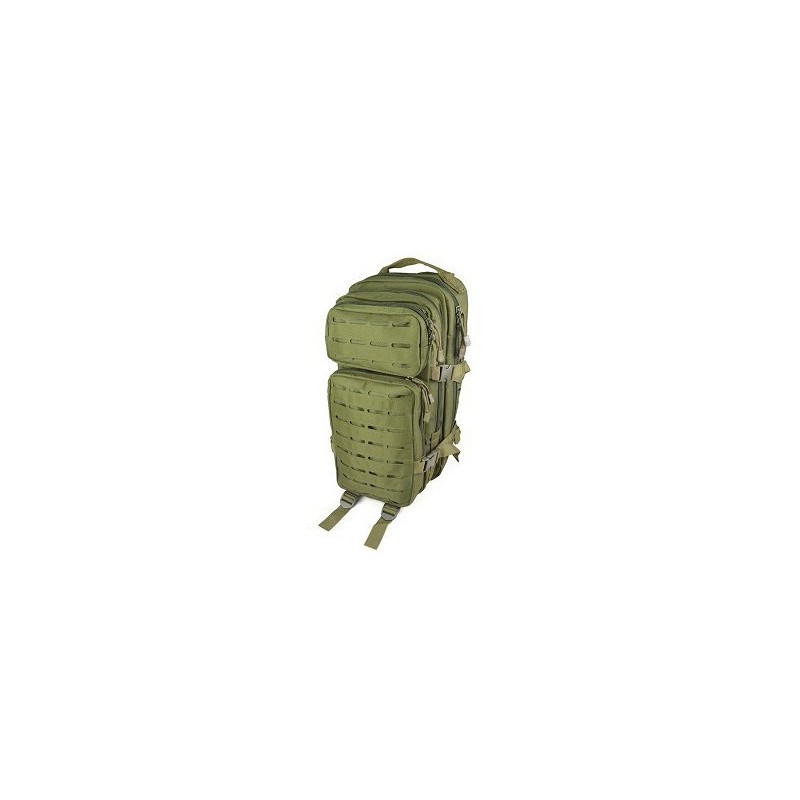Assault backpack in green color, laser cut molle system. CQB. It has two large main compartments with pockets, zipper and mesh.