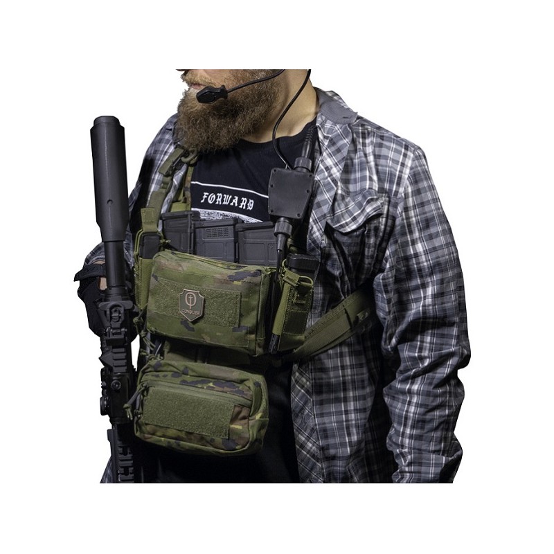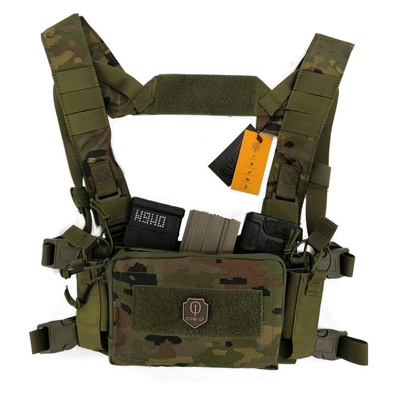 Mini chest rig de la marca Conquer, copia del famoso chest D3CRM de Haley Strategic. Incluye insert triple elástico para cargadores de M4 y doble elástico para cargadores de calibre 7,62 mm. Muy cómodo y una opción perfecta para partidas de verano o milsims de larga duración donde llevaremos la munición de nuestra réplica, teniendo además lo necesario a mano gracias a su gran bolsillo frontal, pudiéndosele acoplar un pouch abdominal gracias al velcro oculto en la parte posterior del mismo.