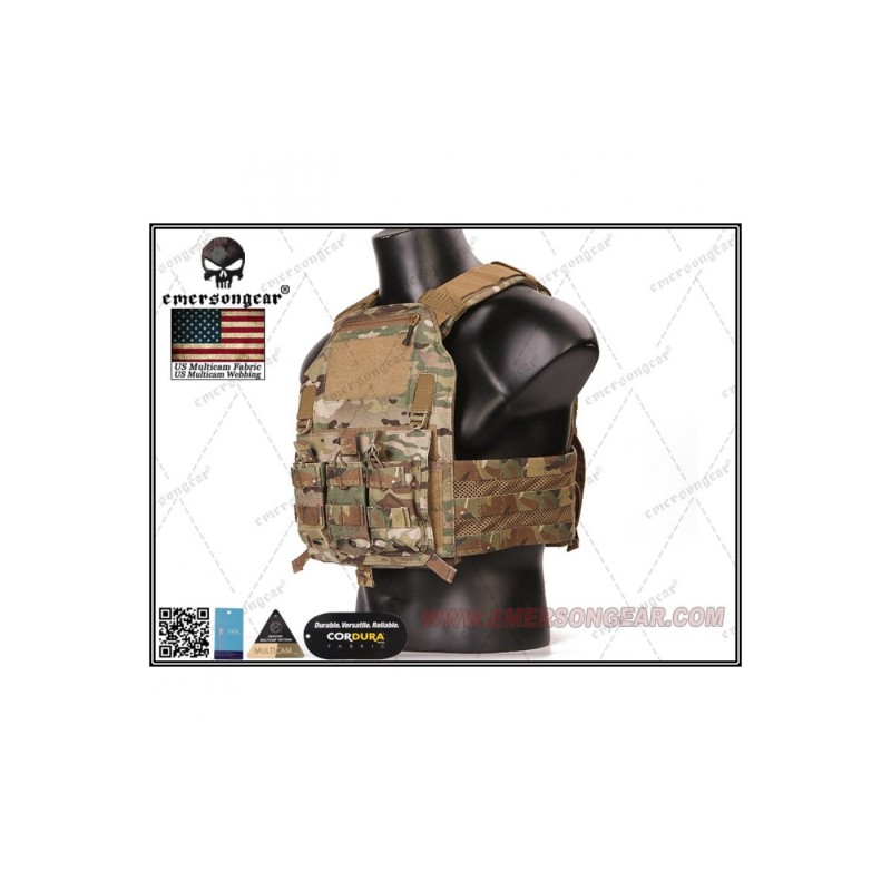 Un porta placas ligero, con un sistema de cummerbund elástico y cubierto con una tela de malla semi-ventilada que recuerda a los chalecos de corte “swimmer” que se utilizan en los entornos acuáticos. Con sistema de porta cargadores incluido en un panel delantero extraíble mediante sistema de velcro y clips, imitado en la parte trasera del mismo con un panel MOLLE donde se pueden colocar todo tipo de pouches o accesorios compatibles con el mismo.