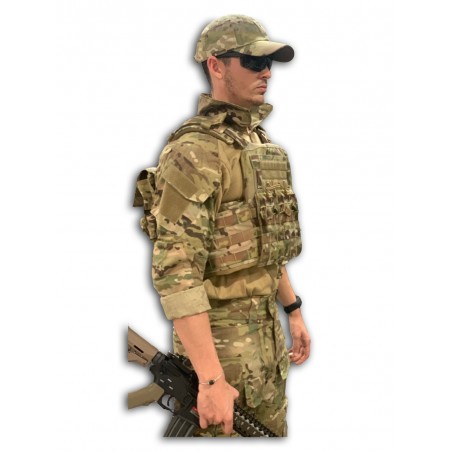 Cuello alto con cremallera que protege del roce de las correas porta fusil.