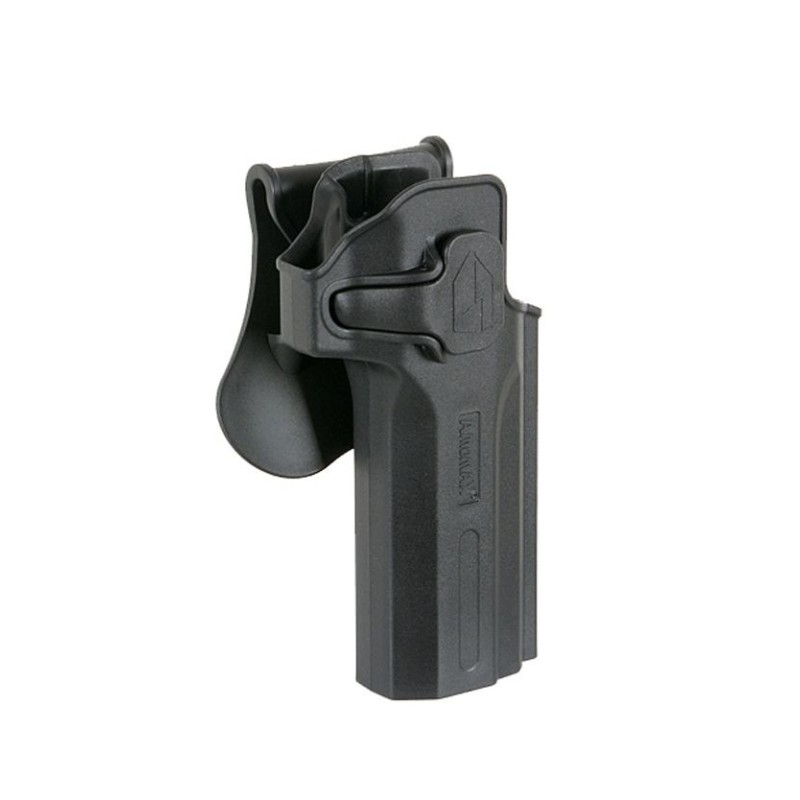 El cuerpo de la funda y la plataforma de transporte están conectados con un engranaje de dientes y un tornillo. El cuerpo de la funda tiene una rotación de 360 grados. Los jugadores de airsoft pueden ajustar fácilmente la posición de transporte.