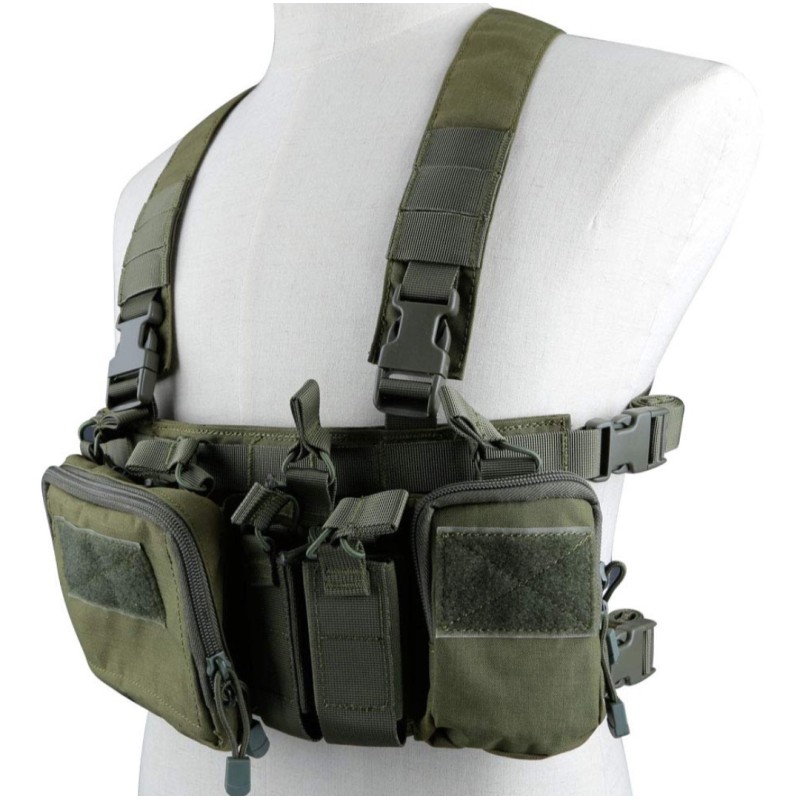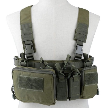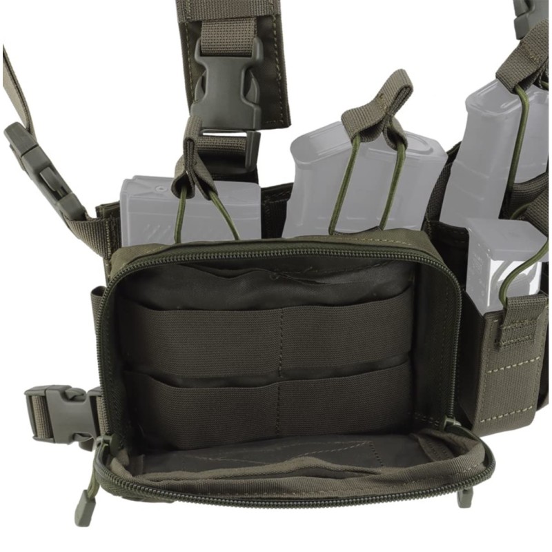Este Chest Rig multimision es capaz de transportar cargadores de M4 y AK, cargadores de pistola, radio, linterna, multi herramientas, granadas de 40 mm o muchos otros accesorios.