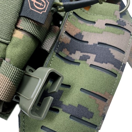 - Arnés robusto con sistema MOLLE cortado a láser y clips intercambiables.