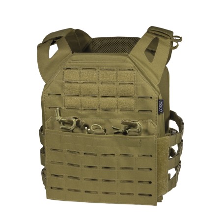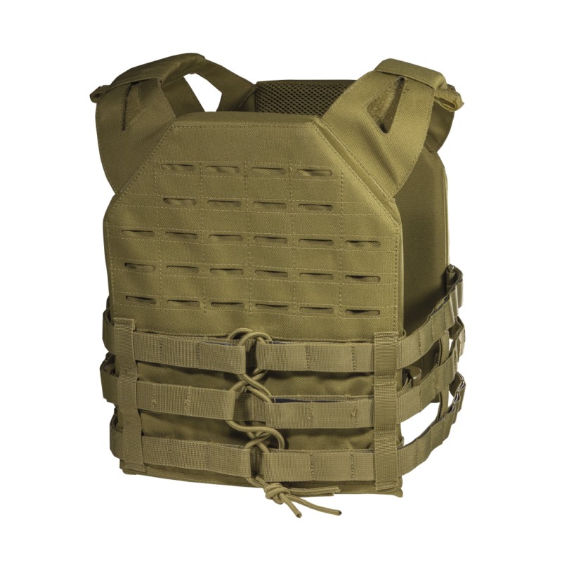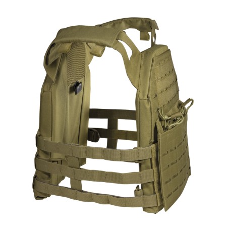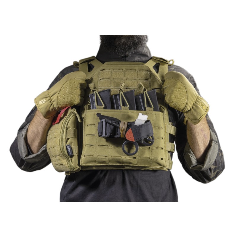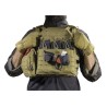 Chaleco táctico porta placas tipo JPC, con sistema de MOLLE Laser Cut que presenta un acabado limpio y uniforme dándole al chaleco una estética minimalista y futurista al mismo tiempo. Posee una solapa delantera tipo canguro donde se pueden insertar cargadores tanto de AR-15 como de la plataforma AK. Las tiras elásticas impiden que dichos cargadores se muevan de su sitio y los ajustes tanto en hombros como en torso lo hacen perfecto para la mayoría de la tallas de jugadores. Una opción más que interesante para nuestras equipaciones desérticas.