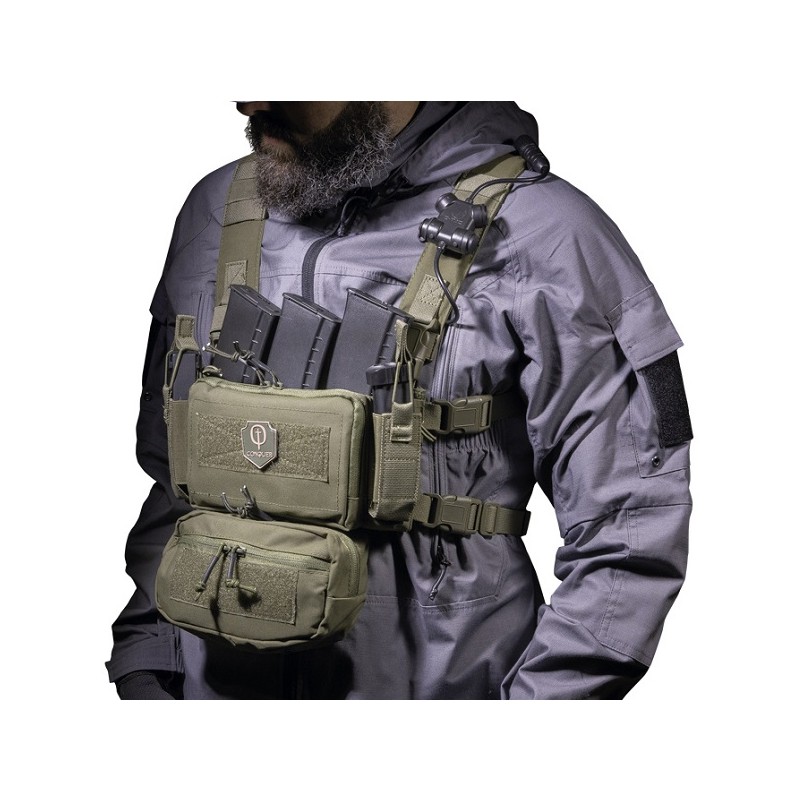 Mini chest rig de la marca Conquer, copia del famoso chest D3CRM de Haley Strategic. Incluye insert triple elástico para cargadores de M4 y doble elástico para cargadores de calibre 7,62 mm. Muy cómodo y una opción perfecta para partidas de verano o milsims de larga duración donde llevaremos la munición de nuestra réplica, teniendo además lo necesario a mano gracias a su gran bolsillo frontal, pudiéndosele acoplar un pouch abdominal gracias al velcro oculto en la parte posterior del mismo.