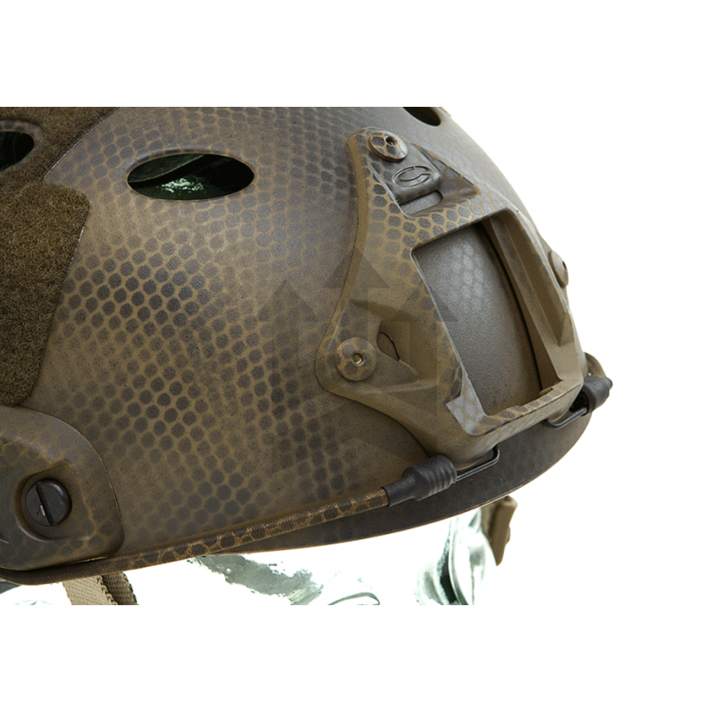 Casco tipo "PJ" fabricado por Emerson Gear, una de las mejores opciones para los airsofters que quieren disfrutar de comodidad, posibilidades de configuración y una magnifica relación calidad/precio. En las monturas laterales podemos insertar adaptadores "Picatinny" para usar todo tipo de accesorios como linternas, cámaras o láseres. Están preparados para montar auriculares así como otros accesorios. Podemos montar máscaras de protección, correas elásticas, visores nocturnos, etc.