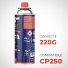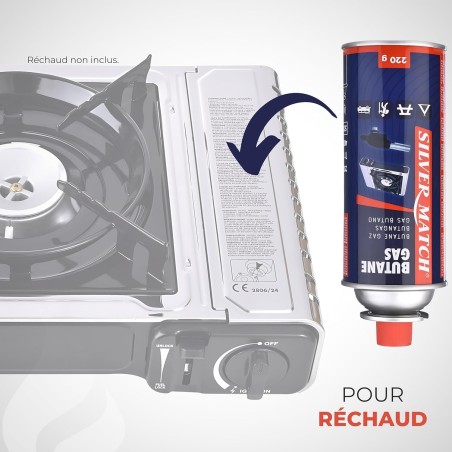 El producto es un cartucho metálico desechable de gas butano (o mezcla de gas licuado) de la marca Silver Match, con una carga nominal de 220 g (equivalente a unos 400 ml de gas licuado) para usar en hornillos portátiles de camping.