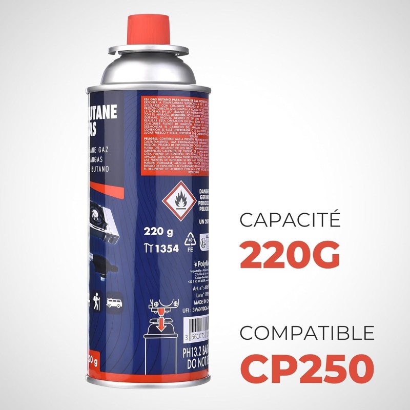 Aquí tienes una lista de características habituales (y algunas específicas) de este tipo de cartucho de butano: