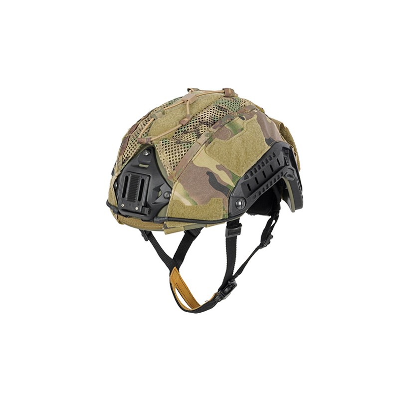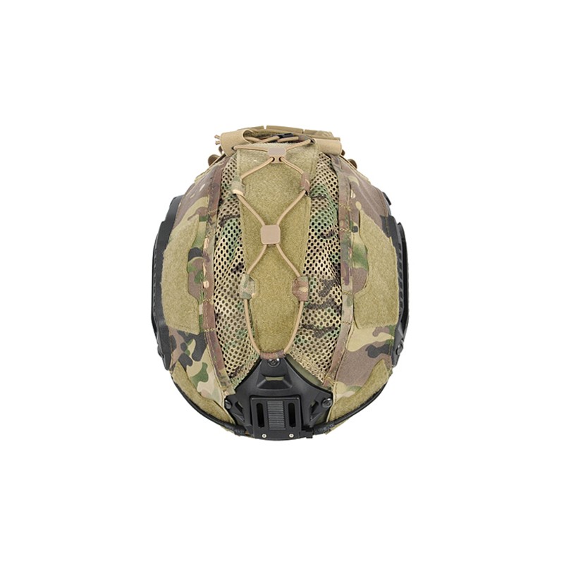 La funda del casco con la función de contrapeso para compensar un dispositivo de visión nocturna o una cámara. Se puede colocar una luz estroboscópica, baterías u otros accesorios pequeños en el bolsillo y manejar el cableado gracias a los enganches. Fabricado con nylon, malla de poliéster, paracord y velcro para colocar parches y marcas de identificación.