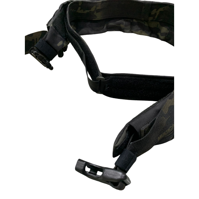 Cuenta con un cinturón semi-rígido interno que nos ayudará a darle rigidez a todo el conjunto (a la vez que nos sujeta los pantalones) y que va cogido con velcro al cinturón exterior. Tan sólo hay que abrirlo parcialmente hasta los broches de seguro e insertar los laterales por los ojales del pantalón, ajustar a la medida y terminar de cerrar todo el conjunto para tener tu primera línea MOLLE operativa para el juego!