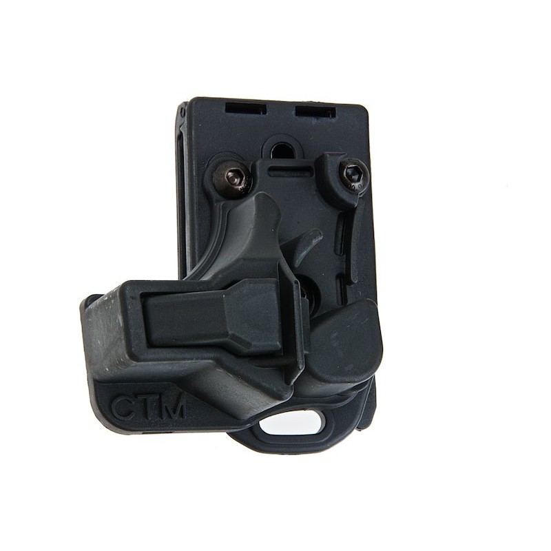 Se observa una base con orificios y tornillos, probablemente compatible con sistemas MOLLE, cinturones tácticos o placas de pernera.