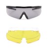 Tres lentes intercambiables de policarbonato: una ahumada para días soleados, una amarilla que mejora contraste en entornos oscuros o de poca luz, y una transparente para uso general.