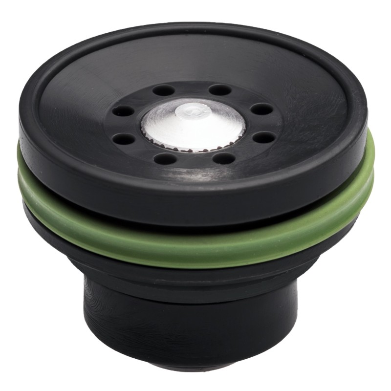 La forma particular de la parte de percusión (cónica degradada hacia el centro) asegura que los orificios de ventilación nunca queden cerrados por la goma de la junta, sin dejar sin embargo demasiado aire entre la junta y la del pistón. Todo ello asegura un perfecto antivacío sin producir nunca caídas de potencia.