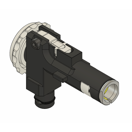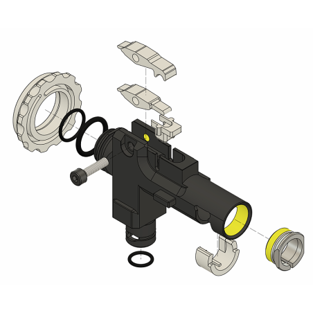 Cuenta con un anilla rotativo con una dureza perfecta para un ajuste milimétrico además de un anillo de sujeción especial que agarra el cañón y lo asegura de forma perfecta. Cuenta también con juntas tóricas que hacen que los cargadores entren de forma suave y firme y proporcionan un sellado inigualable con el nozzle.