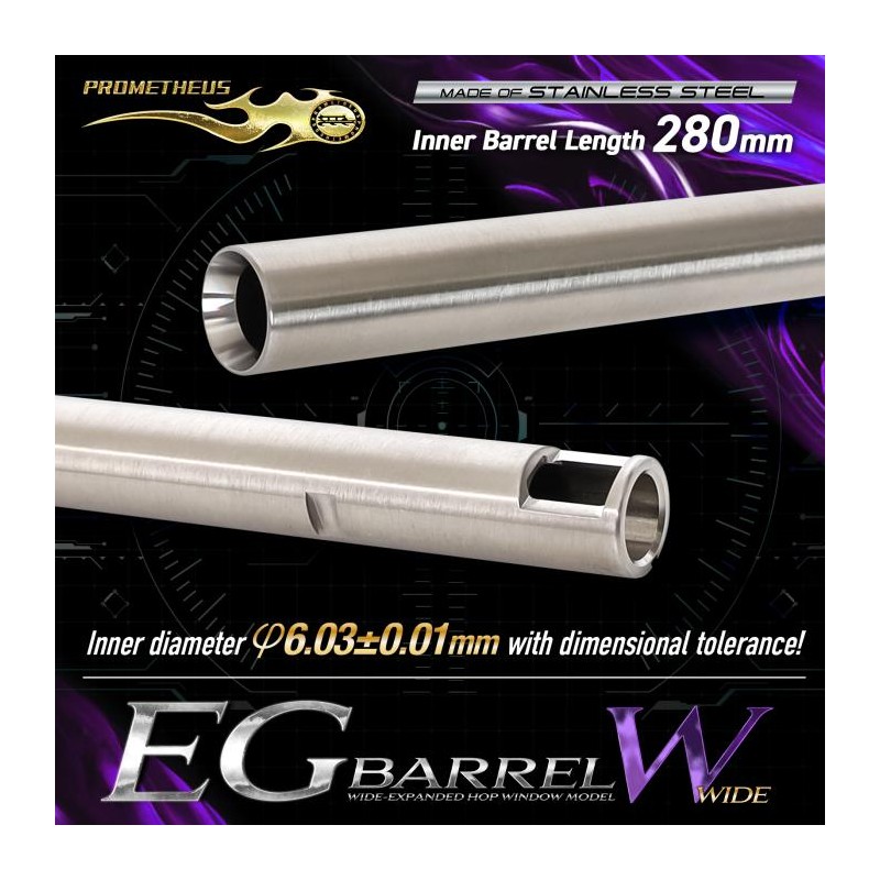 Ancho del cañón interior de 6,03 mm con una tolerancia de ±0,01 mm, fabricado en acero inoxidable (SUS) para una resistencia superior necesaria para mantener la precisión sin necesidad de recubrimientos. La ventana HOP adoptada en este modelo es de tipo ancho similar al cañón EG compatible con Prometheus KRYTAC, lo que lo hace adecuado para configuraciones que involucran R-HOP y otras técnicas de ajuste. También es compatible con otras configuraciones de alto rendimiento, lo que permite una gama más amplia de opciones de personalización.