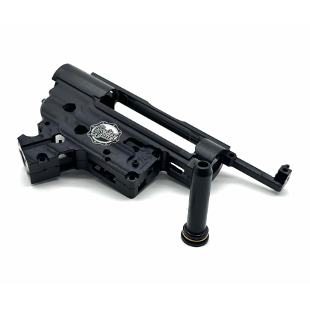 Esta pieza es una carcasa de gearbox mecanizada por CNC de la marca RetroArms, diseñada para sustituir la caja de cambios interna original de réplicas de airsoft Tokyo Marui Next Generation Recoil Shock (NGRS) en configuración SOPMOD/M4. Su función es servir como base resistente y precisa para montar los componentes internos del sistema de transmisión eléctrica, permitiendo configuraciones de mayor rendimiento sin comprometer la durabilidad.