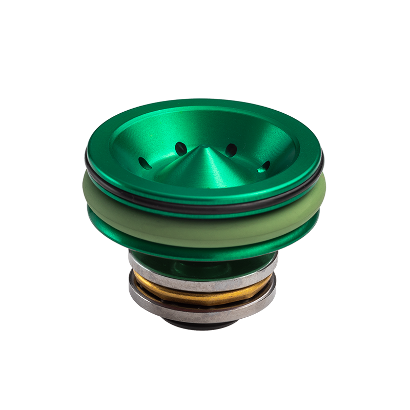 Esta cabeza de pistón tiene puertos en la parte delantera para empujar la junta tórica a medida que avanza, esto asegura que todo el aire en el cilindro sea empujado hacia afuera para propulsar el BB.