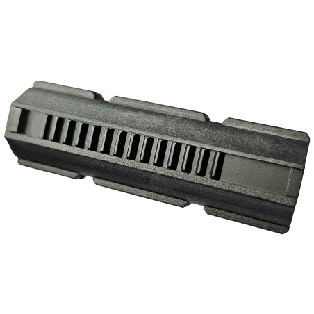 La cremallera reforzada se presenta con el segundo diente faltante y con el tercero rebajado 3 décimas de milímetro, ya que esta configuración predispone al pistón a un ángulo de enganche (AOE) correcto y lo hace adecuado para altas velocidades. El tipo de metal inyectado es SAE 4650 con tratamiento de temple HRC38-42, considerado actualmente el mejor material del mercado para este tipo de uso.