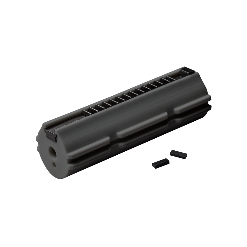 Los refuerzos longitudinales en los laterales de los dientes aumentan la robustez del pistón y evitan el contacto de la cremallera con la pared interna del cilindro.