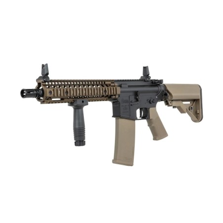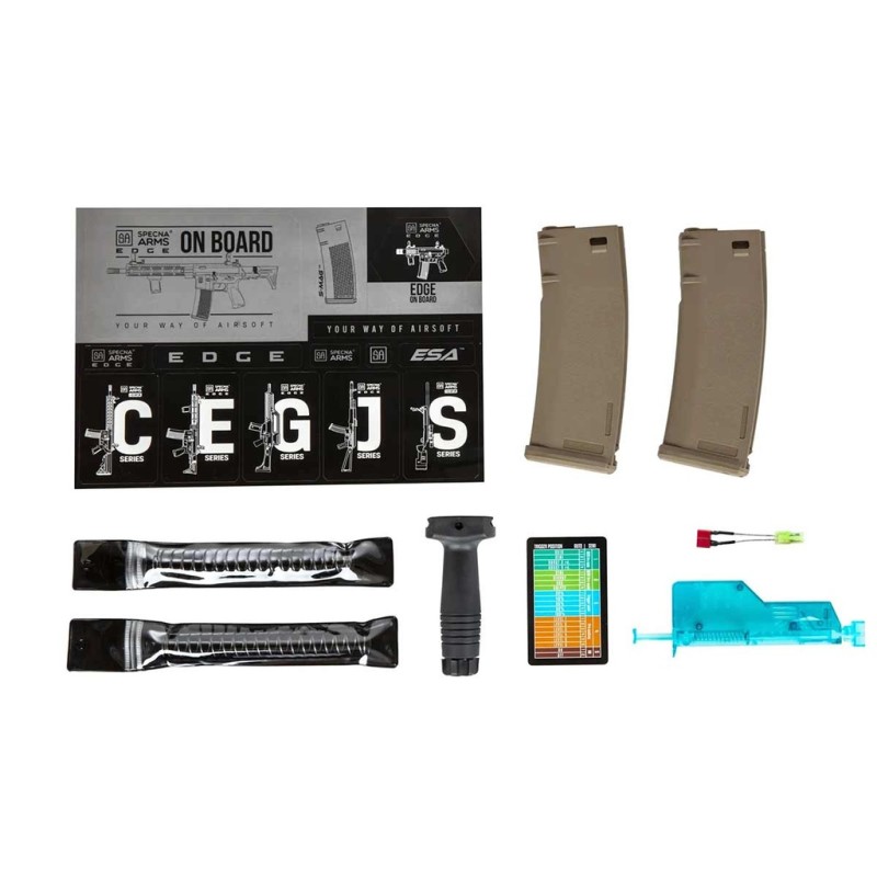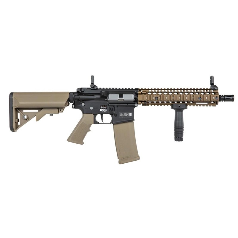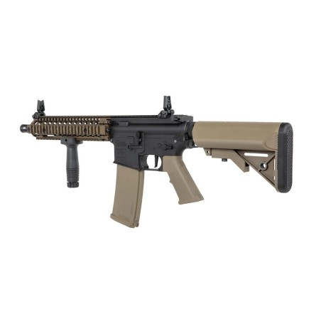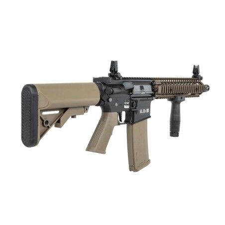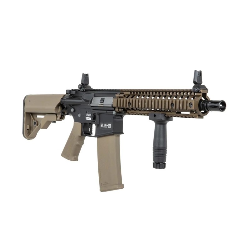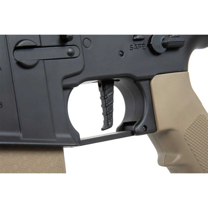 El nuevo fusil PRIME SA-P19 HAL ETU de Specna Arms destaca por su llamativo diseño inspirado en los legendarios fusiles Colt concretamente los modelos estilo MK18 fabricados por la famosa empresa estadounidense Daniel Defense, misma empresa que licencia este modelo de Specna Armas y nos permite disfrutar de marcajes origínales de alta calidad y de sorprendente realismo. El cuerpo dispone de un diseño robusto y muy sólido acompañado de una empuñadura diseñada especialmente para proporcionar la máxima ergonomía posible, está a su vez dispone de una superficie antideslizante que nos brinda un agarre mucho más firme y cómodo. El guardamano MK18 replica perfectamente el diseño de Daniel Defense y lo hace atendiendo al mínimo detalle, los raíles estilo Picatinny nos permite instalar una gran variedad de accesorios como visores de punto rojo, miras de aumentos, linternas, láseres, grips o incluso sistemas AM/PEQ, por otro lado gracias a estar enumero podremos saber la posición exacta de de nuestros accesorios. Por último la culata de tipo crane es ajustable en múltiples posiciones a la vez que nos brinda una amplia capacidad de almacenamiento permitiéndonos usar una gran variedad de baterías.