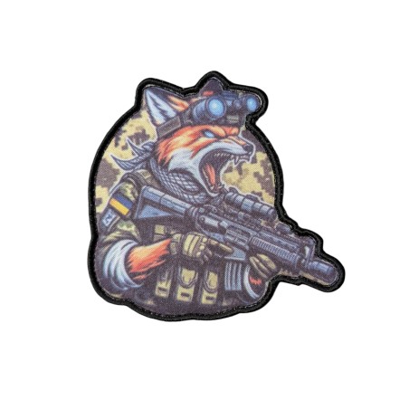 Este parche táctico bordado representa a un zorro antropomórfico equipado como operador militar, portando un fusil y gafas de visión nocturna. Está pensado como elemento decorativo y de identificación para mochilas, chalecos, portaplacas, gorras o cualquier equipación con panel de velcro, aportando un estilo agresivo, táctico y distintivo.