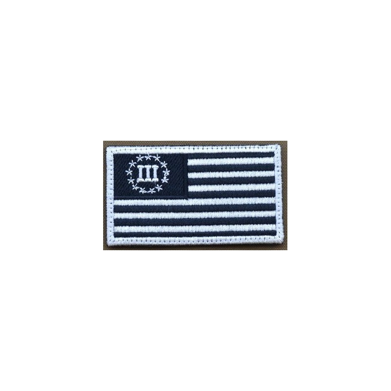 Parche bordado de la bandera insigne de los "3 por ciento", el grupo paramilitar americano que defiende la autodefensa estadounidense, es perfecto para completar nuestra equipación de Airsoft o nuestra colección de parche.