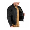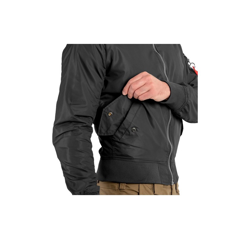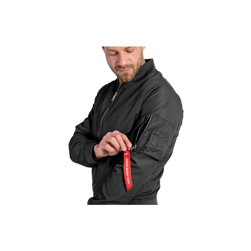 El modelo MA-1 se puede llevar tanto en el lado derecho como en el izquierdo. En la manga hay una cinta típica de este modelo con la inscripción "Quitar antes del vuelo".