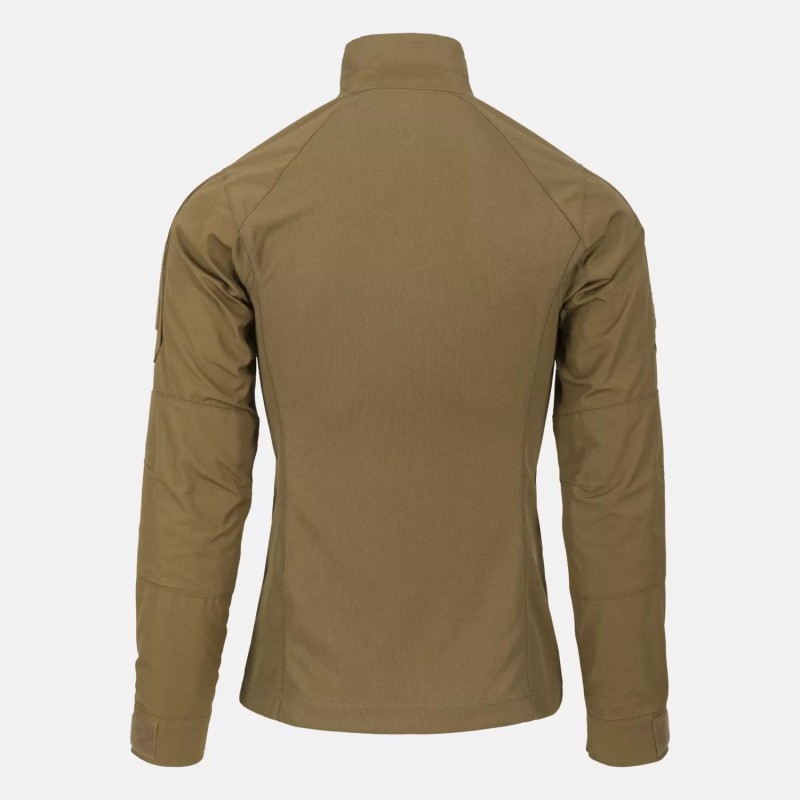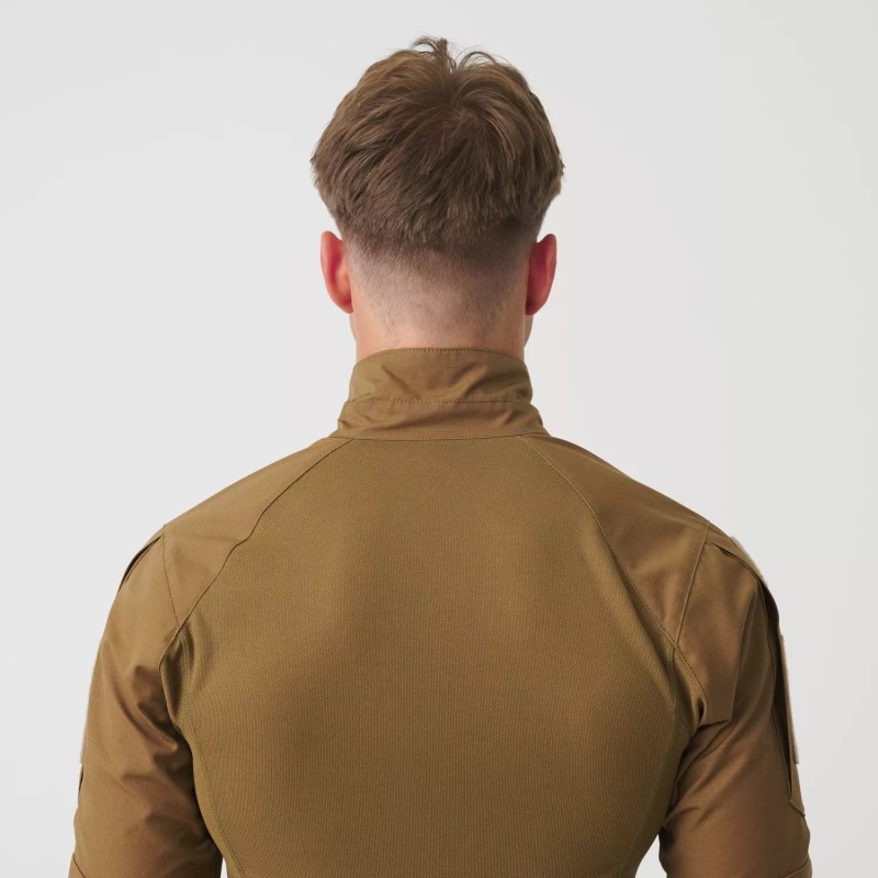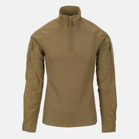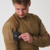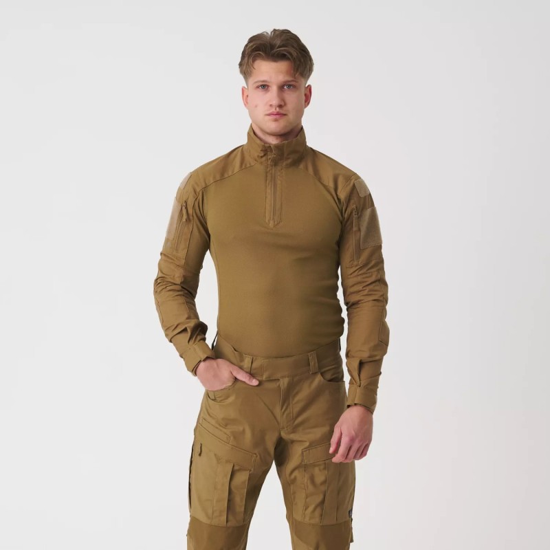 Los prácticos bolsillos con cremallera YKK en los hombros permiten guardar de forma segura objetos pequeños como dispositivos GPS o mapas. Los paneles dobles de velcro en los hombros permiten personalizar la camisa fácilmente añadiendo emblemas o parches, como la bandera nacional o la insignia de la unidad. El cuello alto con cremallera proporciona protección adicional y los puños ajustables con velcro permiten un ajuste perfecto. Además, los refuerzos en los codos ofrecen protección contra la abrasión.